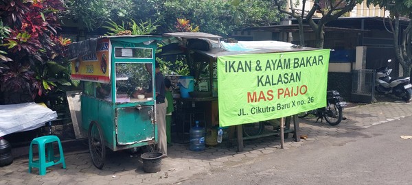Selasa siang di sekitar Jl. Cikutra Baru, matahari sudah cukup terik. Di pinggir jalan, spanduk hijau mencolok bertuliskan "Ikan & Ayam Bakar Kalasan Mas Paijo" tergantung di depan sebuah gerobak. Kalasan. Nama itu yang membuat Penulis berhenti sejenak โ bukan sekadar nama di banner, tapi nama daerah di Kabupaten Sleman, Daerah Istimewa Yogyakarta, yang dikenal dengan ayam bakar berbumbu khas yang meresap hingga ke dalam daging.